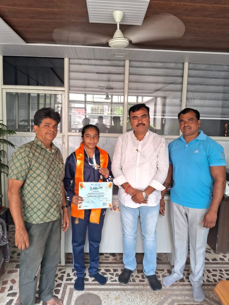जिसमे 44 किलो वजन में प्रथम स्थान प्राप्त कर नगर का नाम रोशन किया आज नगर पालिका अध्यक्ष प्रतिनधि राय सिंह मेवाडा द्वारा माही को मिठाई खिला कर एवम पट्टिका से सम्मानित किया और अपनी और से प्रोत्साहन राशि प्रदान कि ।