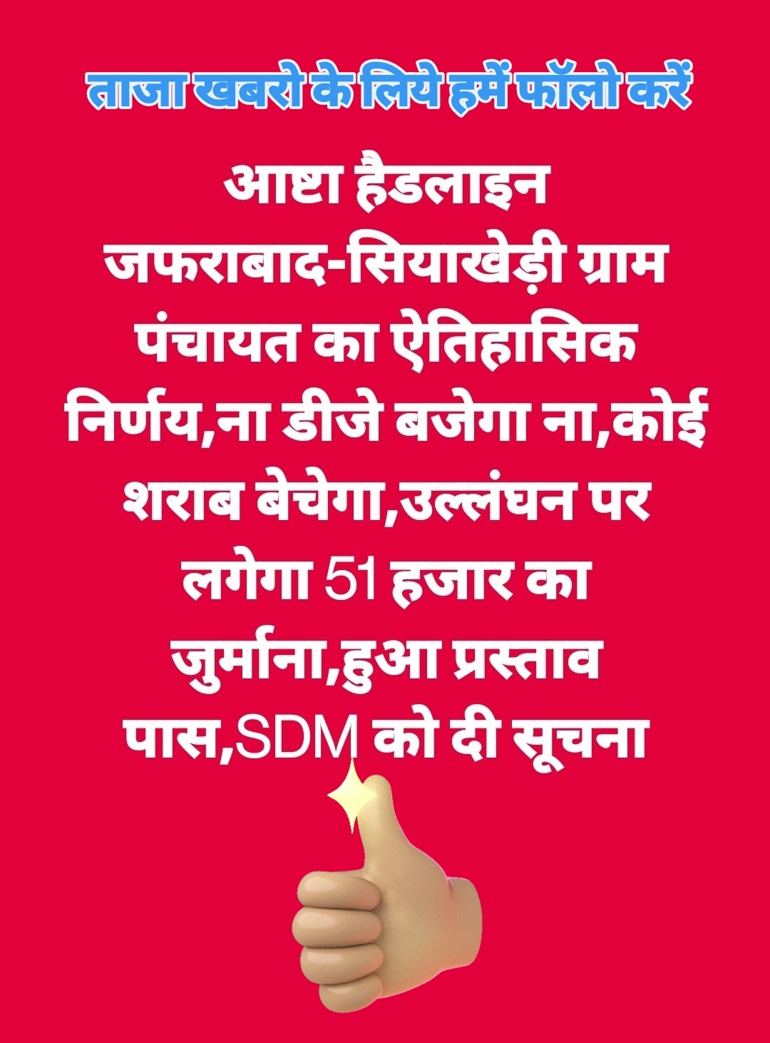 प्राप्त जानकारी अनुसार आष्टा जनपद पंचायत की ग्राम पंचायत जाफराबाद (सियाखेड़ी) के सभी ग्रामीणों ने एक स्वर में सर्वसम्मति से यह निर्णय लिया है कि अब जाफराबाद ग्राम पंचायत में ना ही कोई शराब की बिक्री करेगा और ना ही ग्राम में कोई भी परिवार किसी भी कार्यक्रम में डीजे बजाएगा