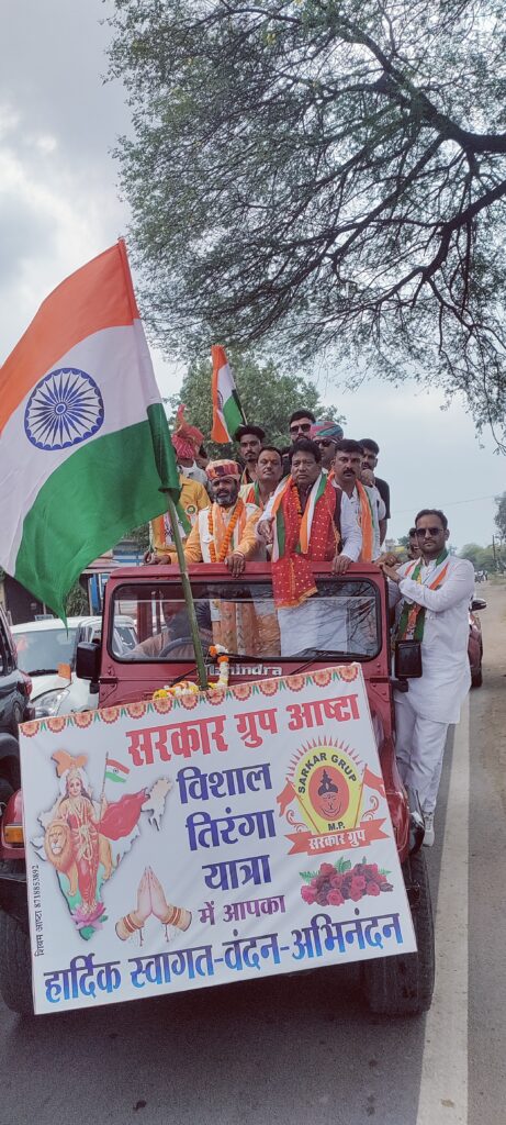 आष्टा । हर घर तिरंगा-घर घर तिरंगा अभियान की भावनाओं को प्रबल करते हुए गैर राजनीतिक संगठन सरकार ग्रुप द्वारा विशाल तिरंगा यात्रा का आयोजन किया गया। तिरंगा यात्रा में विधायक गोपालसिंह इंजीनियर,नपा अध्यक्ष प्रतिनिधि रायसिंह मेवाडा,बलजीतसिंह चौहान इंदौर भी शामिल हुए ।