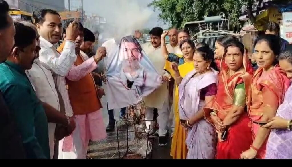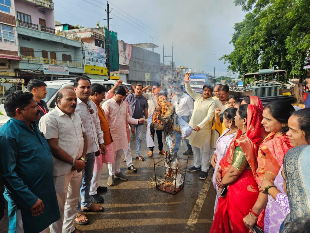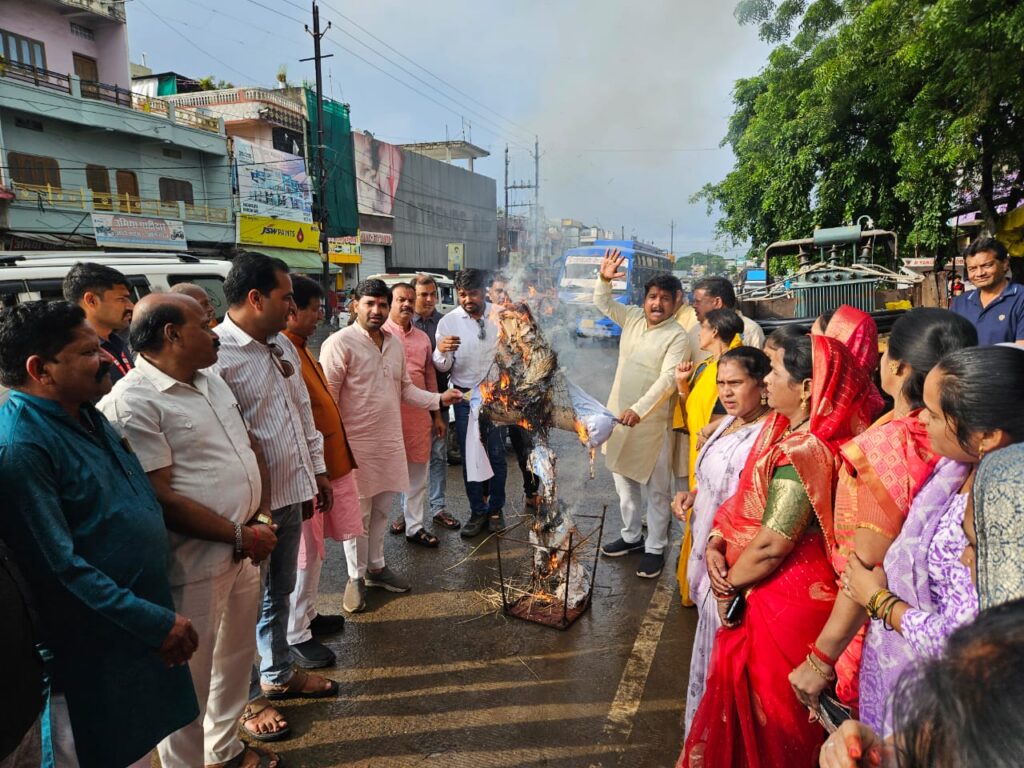 विधायक गोपालसिंह इंजीनियर के नेतृत्व में महिला मोर्चे ने जीतू पटवारी के पुतले की पहले चप्पलों से पिटाई की उसके बाद पुतले का दहन किया गया ।