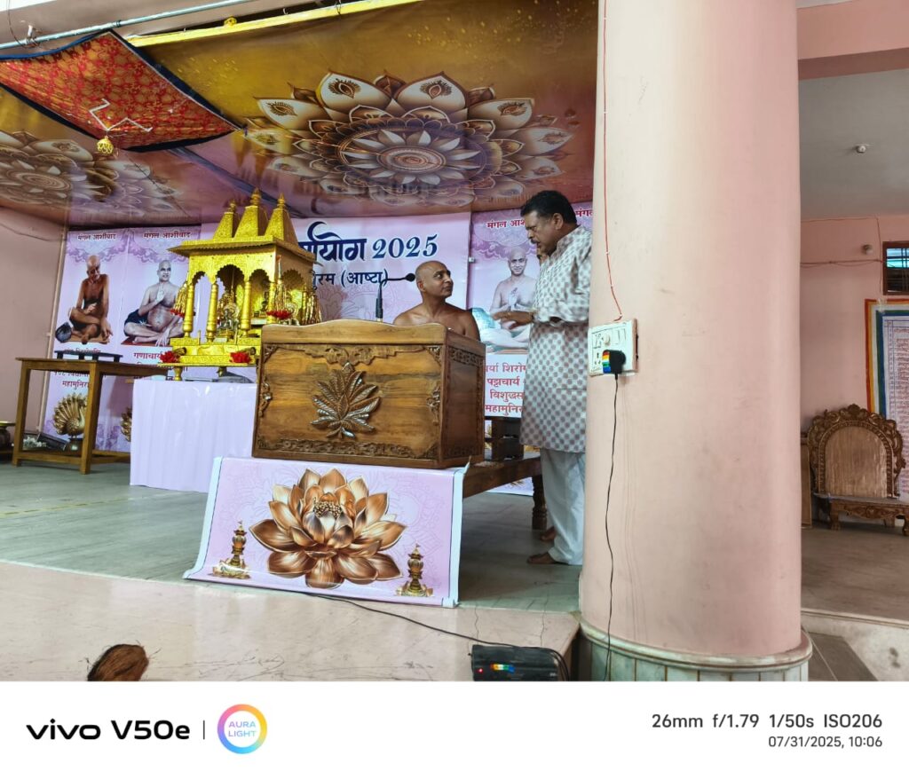 गंज मंदिर समिति ने जलयात्रा में शामिल होने हेतु मुनिश्री को श्रीफल भेंट किया”