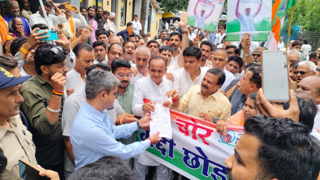 कांग्रेस के जिला स्तरीय मतदाता अधिकार कार्यक्रम के अंतर्गत वोटर अधिकार यात्रा स्थानीय कॉलोनी चौराहा से पूर्व मंत्री सज्जनसिंह वर्मा के मुख्य आतिथ्य एवं जिला कांग्रेस अध्यक्ष राजीव गुजराती के नेतृत्व में निकाल कर तहसील कार्यालय पर प्रदर्शन किया ।कांग्रेस ने अनुविभागीय अधिकारी नितिन टाले को ज्ञापन सोपा । इस अवसर पर पूर्व मंत्री सज्जनसिंह वर्मा ने प्रधानमंत्री नरेंद्र मोदी और चुनाव आयोग को आड़े हाथ लेते हुए कहा कि हमारे नेता राहुल गांधी ने जिस प्रकार से नरेंद्र मोदी और चुनाव आयोग की वोटो की चोरी को पकड़ा है उससे पूरे देश के लोगों में एकदम साफ संदेश गया है कि प्रधानमंत्री नरेंद्र मोदी जनता के वोट से प्रधानमंत्री नहीं बने हैं बल्कि जनता के वोट चोरी करके प्रधानमंत्री बने हैं । इसलिए राहुल गांधी जी के नेतृत्व में पिछले 15 दिनों से बिहार में मतदाता अधिकार यात्रा निकालकर लोगों को जागरूक करने के साथ ही यह संदेश साफ तौर पर देश के लोग दे रहे हैं की वोट चोर गद्दी छोड़ ।