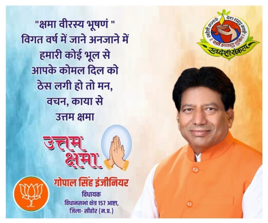 कार्यक्रम में शामिल विधायक गोपालसिंह इंजीनियर ने उपस्तिथ सकल दिगम्बर जैन समाज के सभी श्रावक श्राविकाओं से विगत वर्ष में हुई समस्त भूलो के लिये सकल समाज से क्षमा मांगी । विधायक गोपालसिंह इंजीनियर सहित सभी उपस्तिथ जनप्रतिनिधियों ने