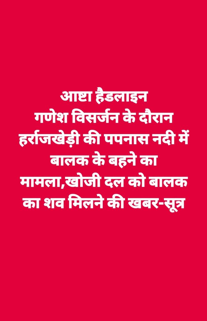 कल गणेश विसर्जन के दौरान ग्राम हर्राजखेड़ी की पपनास नदी में जो बालक बह गया था,देर शाम खबर आई की उक्त बालक का शव खोजी दल ने बरामद कर लिया है….
