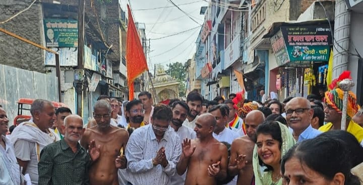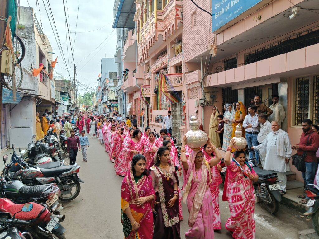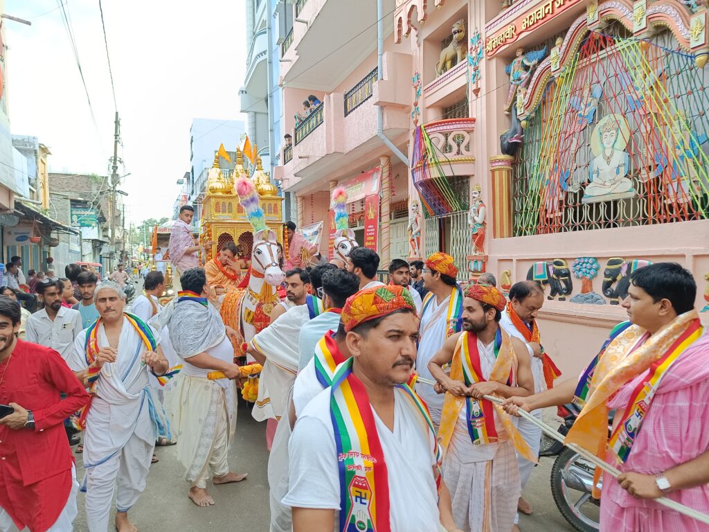 वहां श्रीजी के अभिषेक कर स्वर्ण एवं रजत कलशों को लाभार्थी परिवार की महिलाएं अपने मस्तिष्क पर रखकर मानस भवन में पहुंची। वहां पर भगवान के अभिषेक शांति धारा कर रथयात्रा सुभाष चौक, गंज, बुधवारा,गल चौराहा से सिकंदर बाजार, बड़ा बाजार होते हुए किला मंदिर पर पहुंचे।