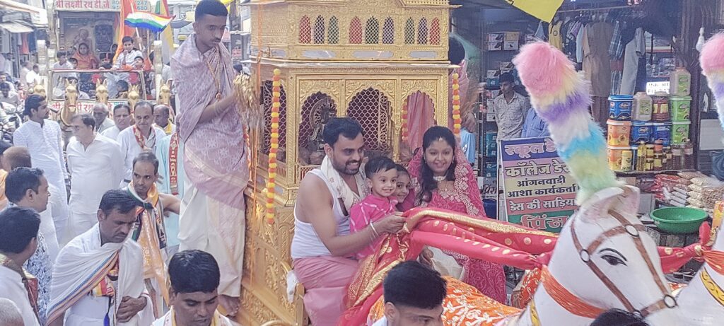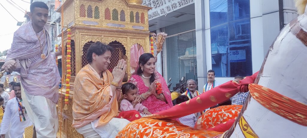 एक रथ पर आचार्य भगवंत के चित्र एवं दूसरे रथ पर लाभार्थी चल रहे थे।