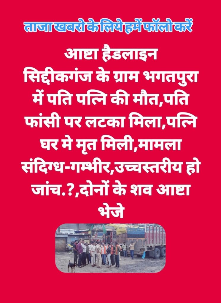 आष्टा । आज प्रातः आष्टा अनुविभाग के सिद्दीकगंज थाना क्षेत्र अंतर्गत आने वाले ग्राम भगतपुरा (उमरधड़) से एक पति-पत्नि की मौत की खबर से पूरे क्षेत्र में सनसनी फैल गई । कुछ समय बाद उक्त मामले की जो जानकारी आई उससे कई तरह के प्रश्न इस मामले को लेकर खड़े हुए,जो जांच के बड़े बिंदु है ।