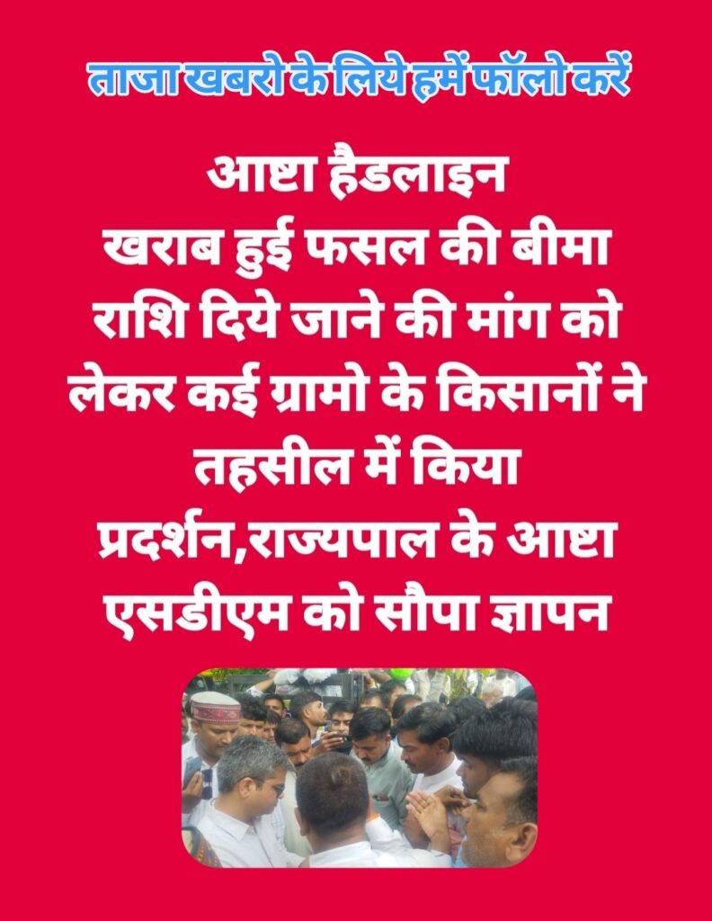 आष्टा । आष्टा में बीमा से वंचित किसानों ने आज तहसील कार्यालय में पहुंचकर राज्यपाल के नाम एसडीएम को ज्ञापन सौंपा । साथ ही हकीमाबाद,धनाना, लोरास कला, हीरापुर,टांडा,दुपाडिया, मालीखेड़ी,मुंदीखेड़ी,काजीखेड़ी, लखीमपुर,जाफराबाद,लसूडिया सुखा,चाचाखेड़ी,शंभूखेड़ी, पटरिया,मोलुखेड़ी,बेदाखेड़ी खामखेड़ा सेवदा सहित दर्जन भर ग्राम के किसानो ने तहसील कार्यालय आष्टा में पहुंच जंगी प्रदर्शन किया ।
