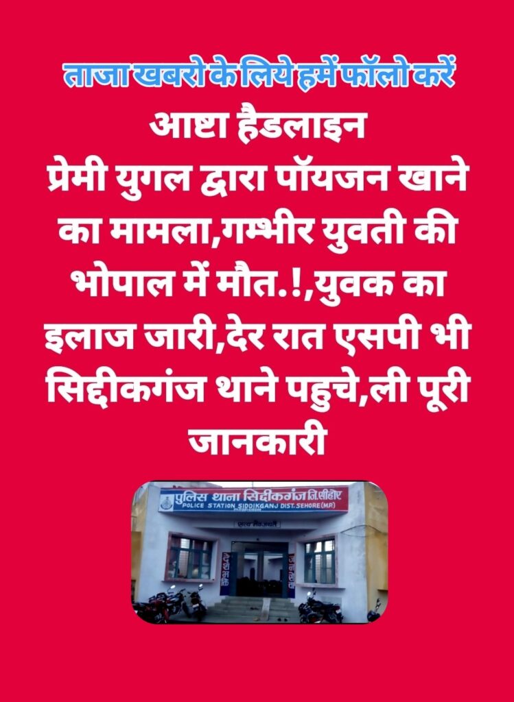 इसी दौरान प्रेमी युगल युवक युवती ने जहरीला पदार्थ खा लिया । जब इन दोनों ने उल्टियां करना शुरू की तब पुलिस के हाथ पांव फूल गये । बताया गया कि सिद्दीकगंज पुलिस तत्काल इन्हें सिद्दीकगंज के सरकारी अस्पताल ले गई हालत गम्भीर देख डॉक्टरों ने इन्हें आष्टा ले जाने को कहा । पुलिस तत्काल इनको ले कर आष्टा सिविल अस्पताल पहुची । ड्यूटी डॉक्टर ने जांच की जिसमे हालत गम्भीर होने पर प्राथमिक उपचार के बाद सीहोर रेफर कर दिया । खबर है की हालत चिंता जनक होने के कारण दोनों को भोपाल रेफर कर दिया गया है । जब इन दोनों को आष्टा लाये ओर हालत गम्भीर देखी तब मिली सूचना पर एसडीओपी आकाश अमलकर,नायब तहसीलदार मुकेश सांवले,टीआई आष्टा गिरीश दुबे भी सिविल अस्पताल पहुचे थे ।