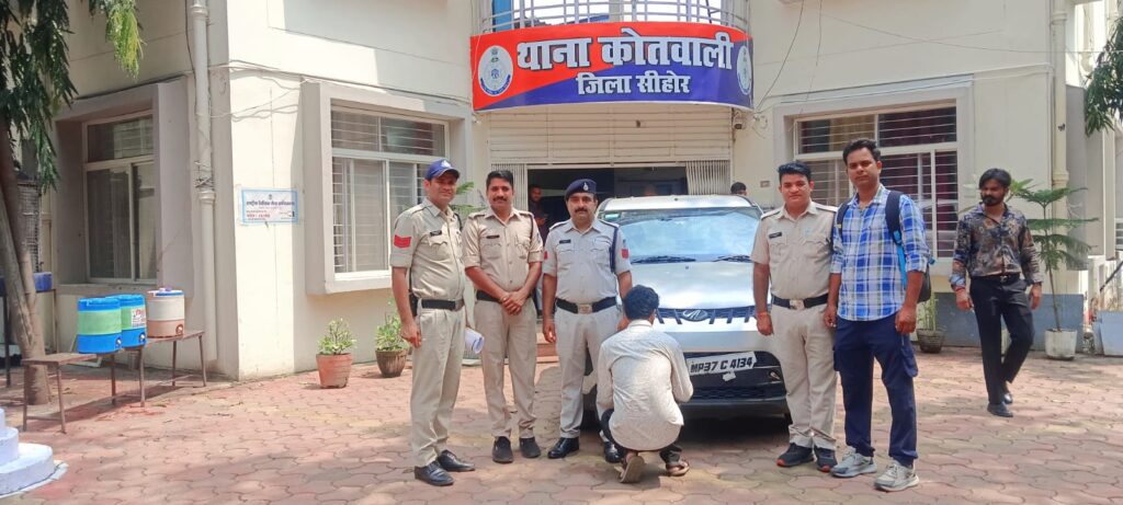 सीहोर । थाना कोतवाली जिला सीहोर के अपराध क्रमांक 765 /2021 धारा 379 भादवी मैं लगभग 4 वर्षों से फरार आरोपी सचिन विश्वकर्मा, पिता जनक सिंह विश्वकर्मा, उम्र 29 साल, निवासी सहोदराबाई राय वार्ड खुरई, जिला सागर को अपने घर थाना खुरई क्षेत्र से थाना कोतवाली पुलिस द्वारा गिरफ्तार कर अपराध सदर में चोरी गया मसरूका एक सिल्वर रंग की महिंद्रा KUV100 कार क्रमांक MP37 C 4134 कीमती करीबन ₹6,00,000/ रुपए को आरोपी सचिन विश्वकर्मा के कब्जे से उसके बताएं स्थान बस स्टैंड शांति नगर बंडा, जिला सागर से जप्त कर कब्जा पुलिस लिया गया।