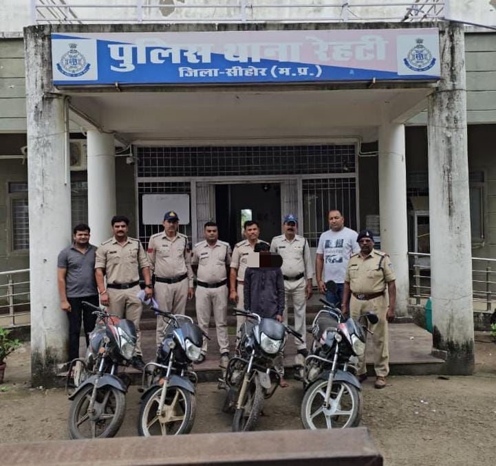 पुलिस अधीक्षक सीहोर दीपक कुमार शुक्ला के निर्देशन में चोरी की घटनाओं की रोकथाम व त्वरित कार्रवाई हेतु दिए गए निर्देशों के पालन में, अतिरिक्त पुलिस अधीक्षक श्रीमती सुनीता रावत एवं एसडीओपी बुदनी रवि शर्मा के मार्गदर्शन तथा थाना प्रभारी रेहटी निरीक्षक राजेश कहारे के नेतृत्व में गठित टीम द्वारा एक शातिर मोटरसाइकिल चोर को गिरफ्तार किया गया है । जिसके कब्जे से कुल 04 चोरी की मोटरसाइकिलें बरामद की गई हैं। प्राप्त जानकारी अनुसार फरियादी भंवर सिंह उइके निवासी वार्ड क्रमांक 8, चौपड़ा कॉलोनी, रेहटी ने थाना रेहटी में रिपोर्ट दर्ज कराई कि उनकी मोटरसाइकिल (क्र. MP37MT1401, HF डीलक्स) रात के समय घर के सामने से अज्ञात चोर द्वारा चोरी कर ली गई है। रिपोर्ट के आधार पर थाना रेहटी में अपराध क्रमांक 497/25, धारा 303(2) BNS के अंतर्गत प्रकरण पंजीबद्ध कर विवेचना में लिया गया।