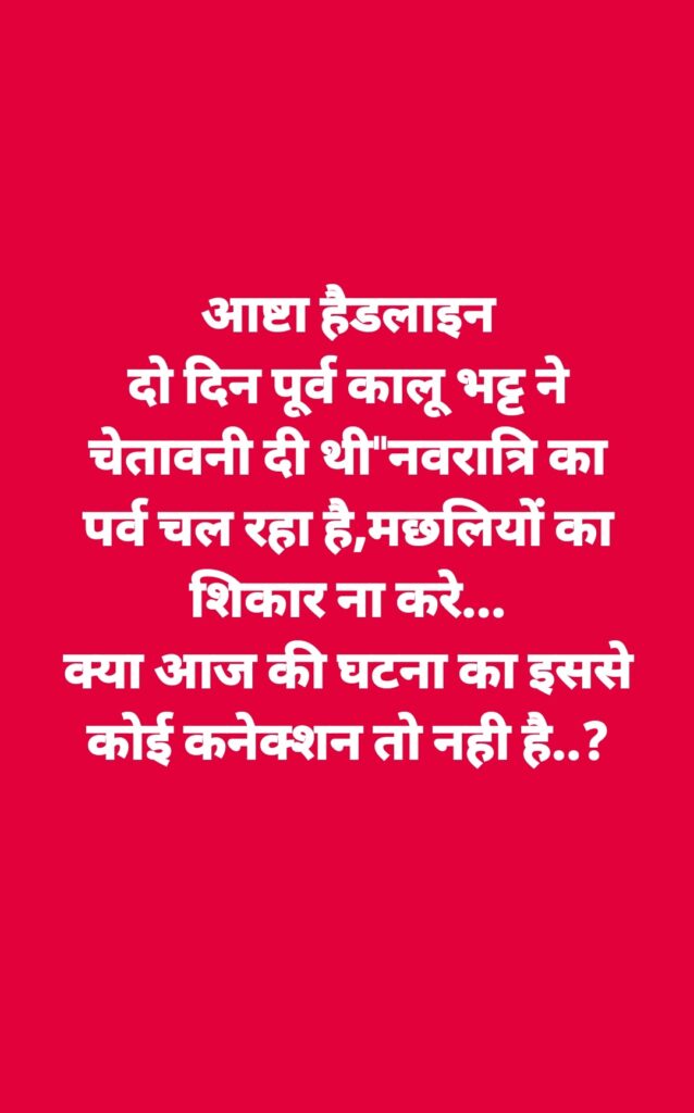 बताया जाता है कि विगत दोनों आष्टा के उक्त तालाब का मछली का जो ठेका था वह अवैध करार देते हुए मछुआरों को सौंप दिया गया था । वही उसके बाद भी कई लोग दिन और रात में उक्त तालाब के चारों ओर बैठकर मछलियों का शिकार करते थे । नवरात्रि का त्यौहार होने के कारण खोकर माता मंदिर के प्रमुख कालू भट्ट ने दो दिन पूर्व ही इन सब मछली का शिकार करने वाले शिकारीयो को चेतावनी दी थी कि वह नवरात्रि पर्व के चलते हुए मछली का शिकार तलाव पर ना करें ।