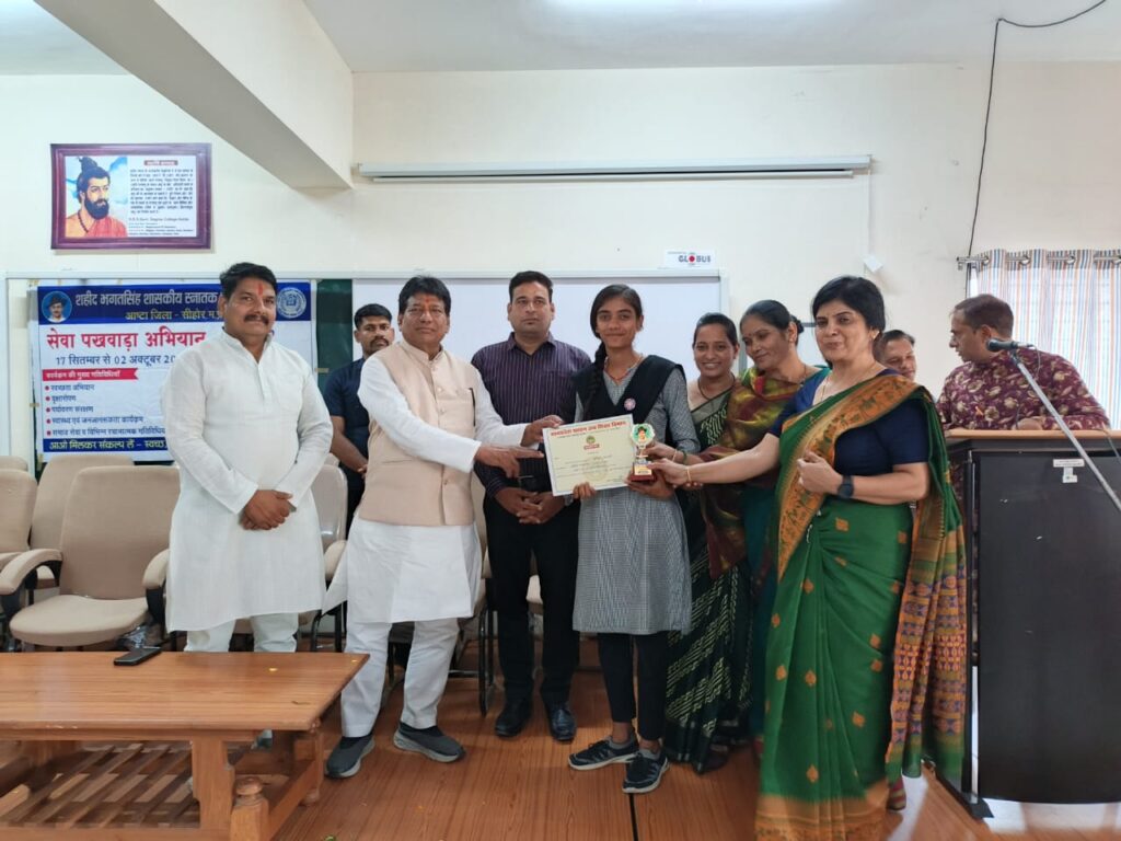 शहीद भगत सिंह स्नातक महाविद्यालय में दिनांक 4 अक्टूबर को सेवा पखवाड़े का समापन एवं पुरस्कार वितरण समारोह संपन्न हुआ। कार्यक्रम के मुख्य अतिथि विधायक गोपाल इंजीनियर, विशेष अतिथि नगर मंडल अध्यक्ष विशाल चौरसिया कार्यक्रम में उपस्तिथ रहे । विद्यालय के प्राचार्य धर्मेन्द्र सूर्यवंशी ने सभी अतिथियों का स्वागत किया । इस अवसर पर विधायक गोपाल सिंह इंजीनियर ने अपने उद्बोधन में कहा की प्रधानमंत्री नरेंद्र मोदी द्वारा चलाए जा रहे स्वच्छता अभियान का उल्लेख करते हुए कहा कि ’’स्वच्छता केवल एक अभियान नहीं बल्कि एक जन आंदोलन है। जब प्रत्येक नागरिक अपने परिवेश को स्वच्छ रखेगा तभी देश स्वस्थ और विकसित बन सकेगा। प्रधानमंत्री जी के नेतृत्व में देश में स्वच्छता को जन-जन तक पहुँचाने का कार्य हो रहा है, जिसमें युवाओं की भूमिका सबसे महत्वपूर्ण है।” विशेष अतिथि विशाल जी चैरसिया ने अपने संबोधन में युवाओं की स्वच्छता में भूमिका पर विशेष जोर देते हुए कहा कि “स्वच्छता केवल सरकार की नही हम सब की जिम्मेदारी है ।