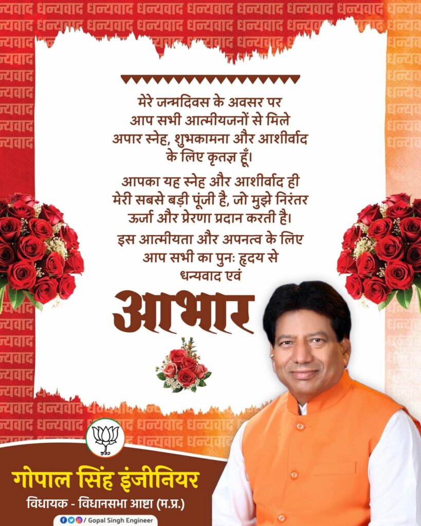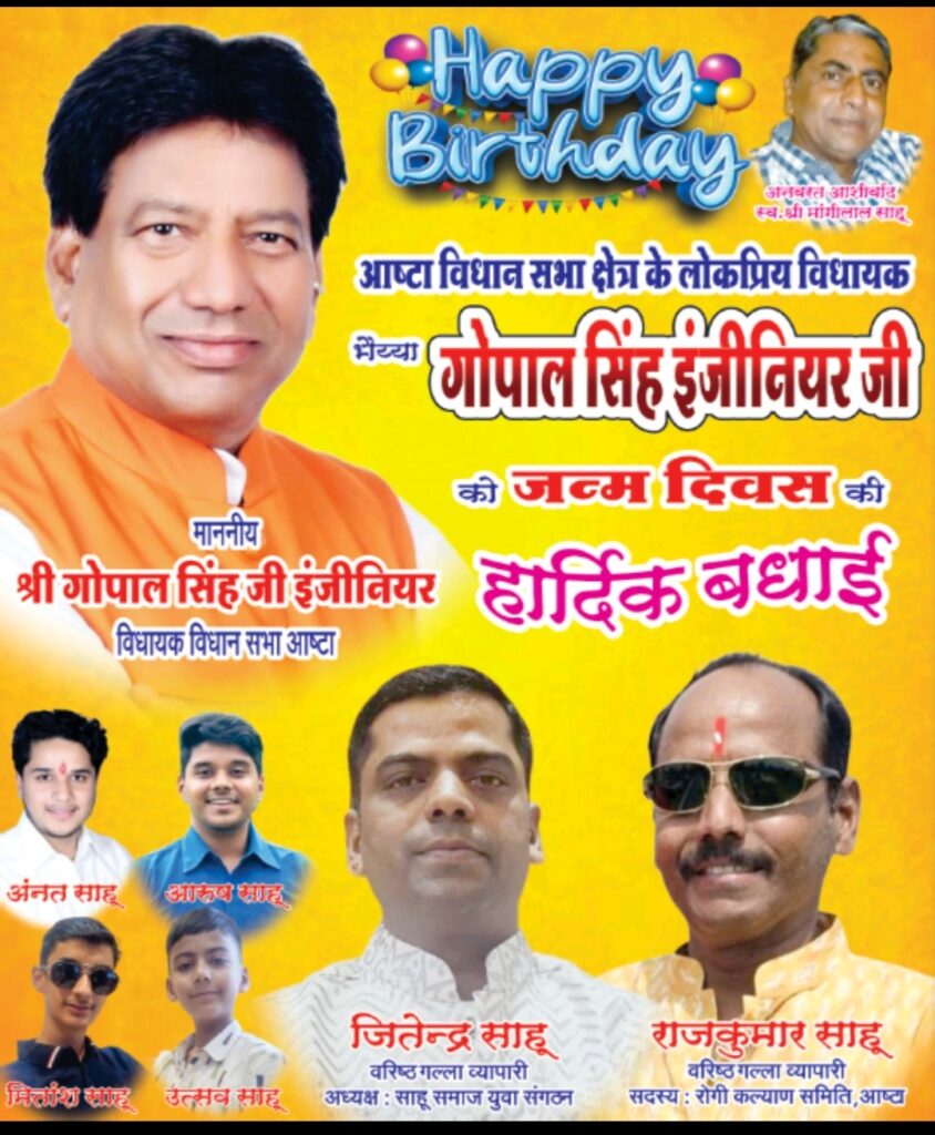 आष्टा विधानसभा क्षेत्र के लोकप्रिय विधायक श्री गोपाल सिंह इंजीनियर का जन्मोत्सव आज आष्टा विधानसभा क्षेत्र के भारतीय जनता पार्टी के बूथ स्तर तक के कार्यकर्ताओं में उत्साह उमंग के साथ विधायक का जन्मोत्सव मनाया ।