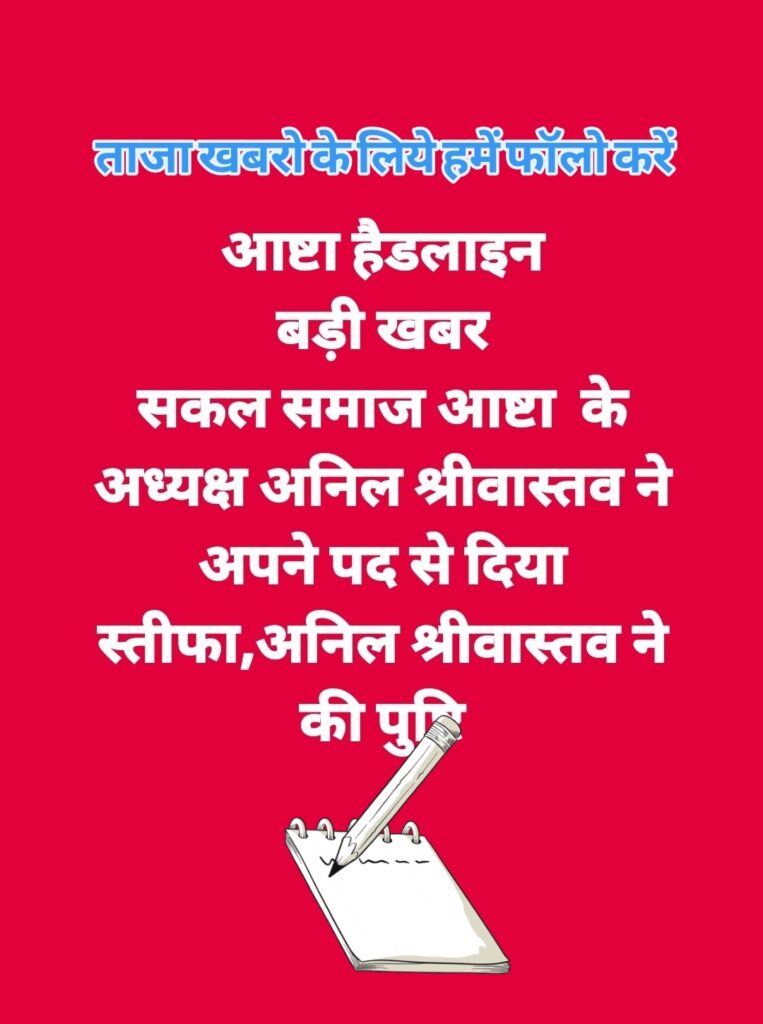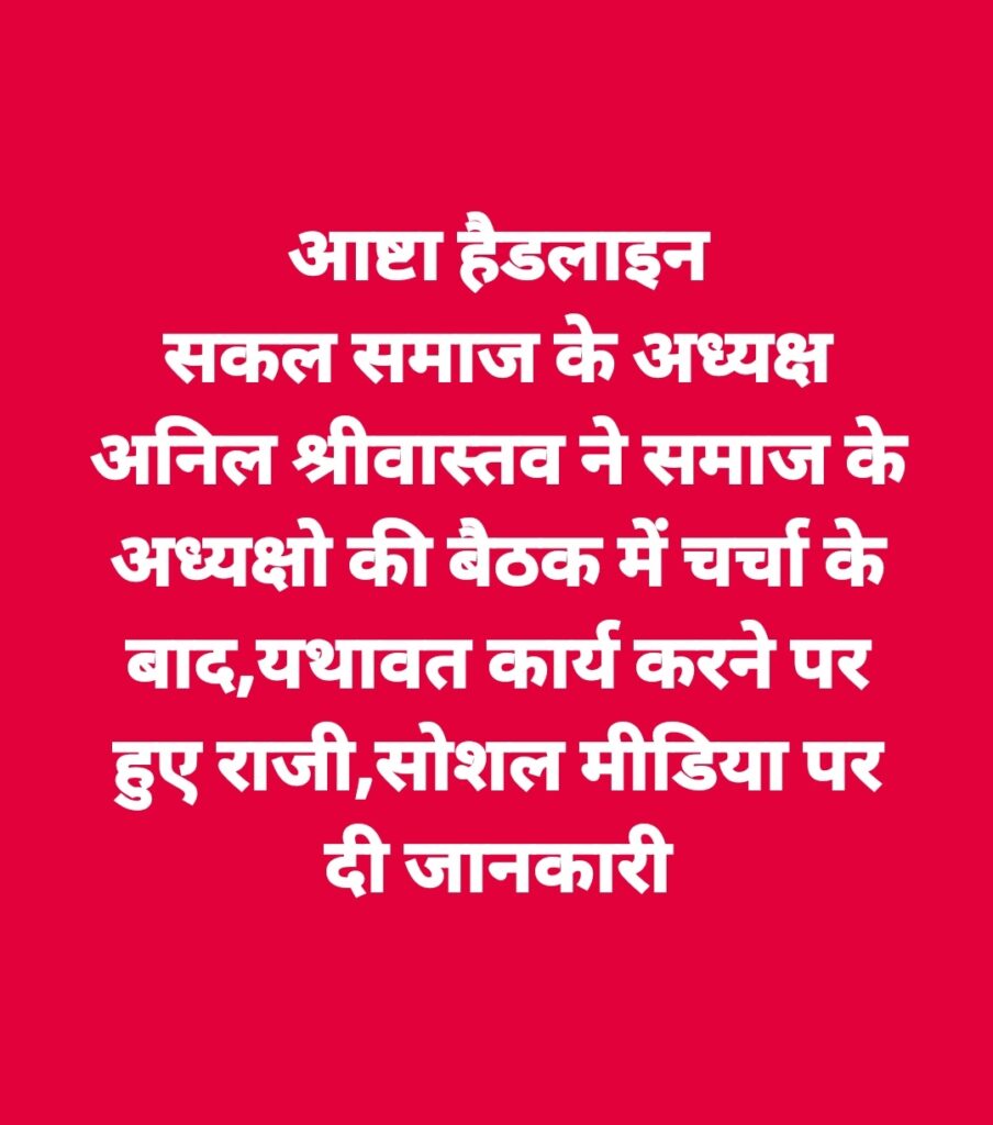 स्मरण रहे कुछ दिनों से हिन्दू समाज मे जो मुद्दे उठ रहे थे,जो विवाद अखबारों की सुर्खियां बन रहे है,उन सभी वाद विवादों से दुखी हो कर आज सकल हिन्दू समाज के अध्यक्ष अनिल श्रीवास्तव ने अपने पद से स्तीफा समाज को सौप दिया है । उक्त खबर आने के बाद आनन फानन में फिर हुई समाज अध्यक्षों की बैठक जिसमे वे माने ओर फिर आया बयान,अनिल श्रीवास्तव ने पद पर बने रहने,कार्य करने पर हुए सहमत।