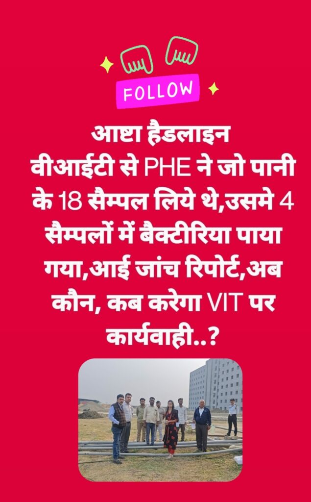 इस मामले में जब आज हमने आष्टा एसडीएम नितिन टाले से जानकारी ली,तब एसडीएम ने बताया की पीएचई ने वीआईटी से जो 18 सैम्पल पानी के लिये थे,उसकी जांच रिपोर्ट प्राप्त हो गई है,18 में से 4 पानी के सैम्पल फैल हुए