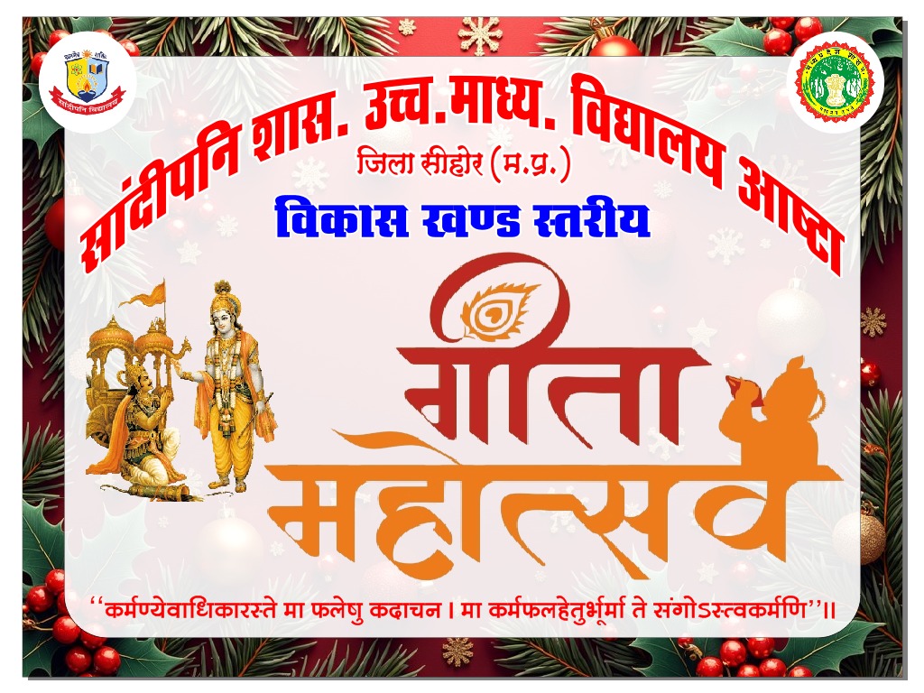 उच्चशिक्षा विभाग, भोपाल के निर्देशानुसार शहीद भगतसिंह शासकीय महाविद्यालय, आष्टा में गीता जयंती के पावन अवसर पर गीता महोत्सव कार्यक्रम का आयोजन किया गया। महाविद्यालय के प्रभारी प्राचार्य धर्मेंद्र सूर्यवंशी के मार्गदर्शन एवं कार्यक्रम प्रभारी डॉ. दीपेश पाठक के संयोजन में यह आयोजन अत्यंत सफल रहा।