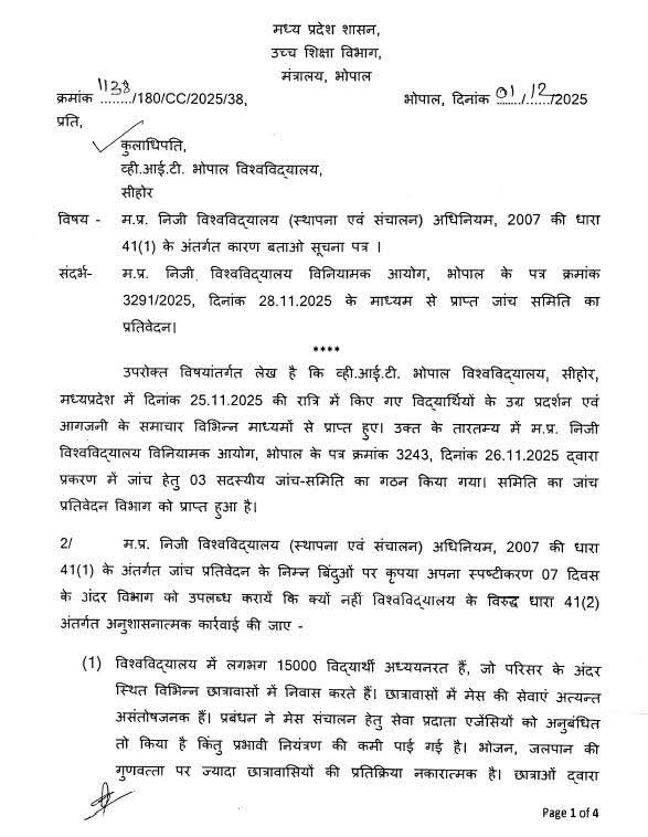 राज्य शासन के उच्च शिक्षा विभाग ने, सीहोर जिले में आष्टा अनुविभाग के कोठरी में स्थित निजी वीआईटी विश्वविद्यालय में मेस व्यवस्था, छात्रावास प्रबंधन, स्वास्थ्य सुविधाओं और अनुशासन तंत्र से जुड़ी गंभीर अनियमितताओं पर कड़ा रुख अपनाया है। जांच समिति की रिपोर्ट प्राप्त होने के बाद विभाग ने विश्वविद्यालय प्रशासन से 7 दिनों में बिंदुवार जवाब मांगा है। विभाग ने स्पष्ट कहा है कि छात्रों के स्वास्थ्य, सुरक्षा और बुनियादी सुविधाओं पर किसी भी तरह की लापरवाही बर्दाश्त नहीं की जाएगी।