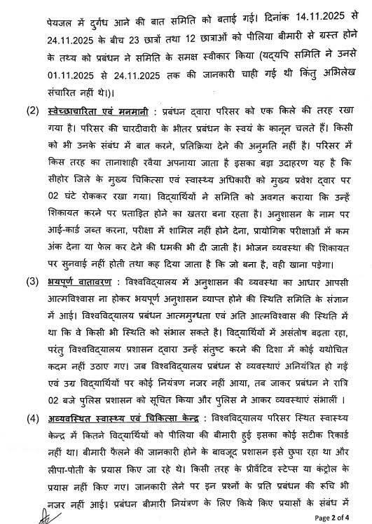 समिति ने पाया कि विश्वविद्यालय परिसर स्थित स्वास्थ्य केंद्र में बीमारी फैलने की जानकारी होने के बावजूद समय पर उपचार, परीक्षण और रिपोर्टिंग की प्रक्रिया सक्रिय नहीं की गई। स्वास्थ्य केंद्र स्टाफ केवल औपचारिक स्तर पर दवाएँ दे रहा था। बीमारी नियंत्रण के लिए न तो प्रबंधन ने कोई विशेष अभियान चलाया गया और न ही प्रभावित छात्रों की नियमित मॉनिटरिंग की गई।रिपोर्ट में कहा गया है कि बीमारी फैलने की वास्तविक स्थिति विश्वविद्यालय प्रशासन की जानकारी में थी, फिर भी आवश्यक कदम समय पर नहीं उठाए गए।