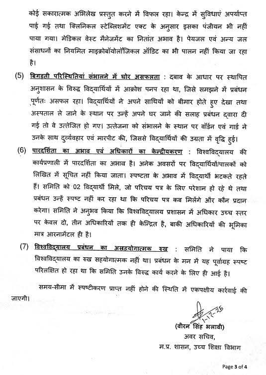 स्पष्टीकरण, CMHO और स्वास्थ्य अधिकारियों को गेट पर रोके जाने की पूरी जानकारी और जिम्मेदार व्यक्तियों की पहचान, बीमारी फैलने के बाद स्वास्थ्य केंद्र और प्रबंधन द्वारा अपनाए गए नियंत्रण उपायों का विवरण आदि समस्त विद्यार्थी हितों से जुड़े विषयों पर 7 दिनों के अंदर स्पष्टीकरण मांगा है। उच्च शिक्षा विभाग ने चेतावनी दी है कि यदि उत्तर संतोषजनक नहीं रहा तो निजी विश्वविद्यालय अधिनियम के तहत कड़ी कार्रवाई की जाएगी।