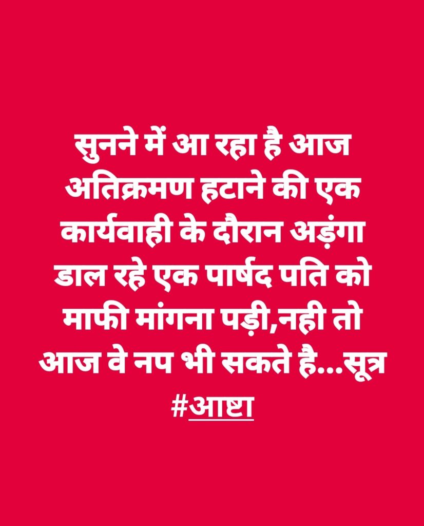 जब तक पूर्ण रूप से शासकीय भूमि से अतिक्रमण नही हट जाता तब तक यह कार्यवाही जारी रहेगी। इस अवसर पर पटवारी वीरेन्द्रसिंह ठाकुर, अतिक्रमण सहायक कैलाश घेंघट, गोलू घेंघट सहित अतिक्रमण टीम की सराहनीय भूमिका रही। सूत्रों से मिली जानकारी अनुसार आज जैसे ही नपा एवं प्रशासन की संयुक्त उक्त कार्यवाही पुलिस बल की उपस्तिथि में शुरू हुई तब खबर है नपा के कुछ जनप्रतिनिधि उक्त कार्य मे अड़ंगा डालने जा पहुचे लेकिन आज उनेह मुह की खाना पड़ी,खबर है एक पार्षद पति को तो माफी भी मांगना पड़ी,अगर वे आज माफी नही मांगते तो शायद शासकीय कार्य मे बाधा पहुचाने की धाराओं में नप जाते.!