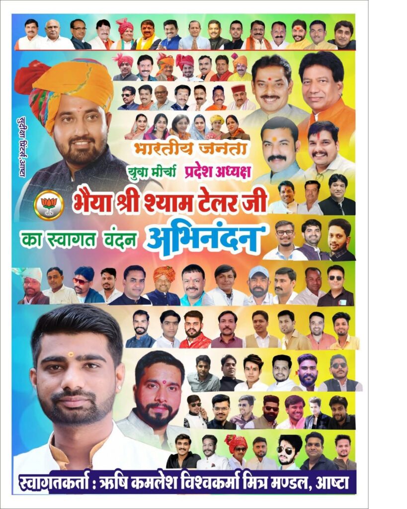 भारतीय जनता युवा मोर्चा के नवनियुक्त प्रदेश अध्यक्ष श्री श्याम टेलर का आज सोमवार को शाजापुर से भोपाल पदभार ग्रहण करने जाते वक्त आष्टा पहुचने पर आष्टा बायपास चौपाटी पर भारतीय जनता युवा मोर्चे के नेता कमलेश विश्वकर्मा के नेतृत्व में भव्य ऐतिहासिक स्वागत सम्मान किया गया । प्रातः करीब 12 बजे प्रदेश अध्यक्ष श्याम टेलर,आष्टा विधायक गोपालसिंह इंजीनियर के साथ जैसे ही वाहनों के काफिले के साथ चौपाटी पहुचे ढोल ढमाके, आतिशबाजी,जेसीबी क्रेन से पुष्पवर्षा कर भव्य स्वागत किया ।