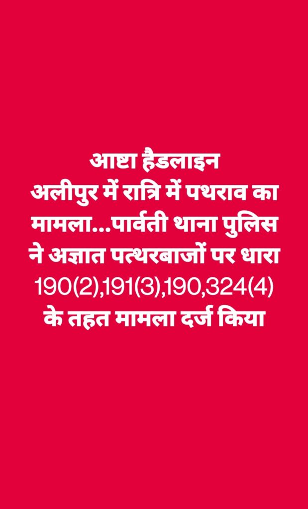 सूचना के बाद एसपी दीपक कुमार शुक्ला आष्टा पहुचे रात्रि में इस प्रतिनिधि को एसपी ने बताया की वे हर स्तिथि पर नजर रखे हुए है । सूत्रों से मिली जानकारी अनुसार मामूली विवाद के बाद अलीपुर के एक मोहल्ले विशेष से करणी सेना के कार्यकर्ताओं एवं उनके वाहनो पर काफी पथराव किया गया ।