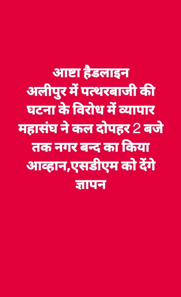 इस पूरे मामले की निश्चित रूप से जांच होना चाहिये एवं शांत आष्टा की फिजा बिगड़ने पथराव करने वालो पर सख्त कार्यवाही की मांग उठी है । आज सुबाह स्तिथि सामान्य नजर आई एवं पुराना बस स्टैंड एवं अलीपुर चोराहे पर भारी पुलिस बल तैनात नजर आया । रात्रि में ही
