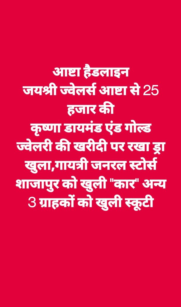 तथा 25 हजार की खरीदी पर पांच ग्राहकों के लिए स्कूटी भी रखी गई थी । जिसमें दो स्कूटी पूर्व में संतोष राठौर आष्टा एवं दिनेश वर्मा रनायल के नाम खुल चुकी थी ।