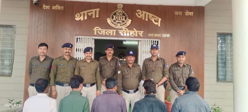 पुलिस अधीक्षक दीपक शुक्ला द्वारा थाना प्रभारी आष्टा गिरीश दुबे को संदिग्ध व्यक्तियों की तत्काल धर पकड़ हेतु निर्देशित किया गया। थाना प्रभारी गिरीश दुबे द्वारा अपने थाने बल की दो टीमे गठित की गई। सूचना पर थाना आष्टा की दोनों पुलिस टीमे ग्राम नानकपुर यात्री प्रतीक्षालय के पास पहुंची तो प्रतीक्षालय में बैठे पांच संदिग्ध व्यक्ति वहां से भागने का प्रयास कर रहे थे जो पांचो व्यक्तियों को दोनों पुलिस टीम के कुल 09 सदस्यो द्वारा स्थानीय ग्रामवासियों की मदद से घेराबंदी कर पकड़ा गया।पकड़े गए पांचो संदिग्ध व्यक्तियों के पास घातक हथियार तलवार, धारदार चाकू,नुकीला सब्बल, लोहे की राड ओर एक लोहे की नक़ब (ताले, कुंदे तोड़ने का औजार )पाए गए। पांचो आरोपियों से प्राप्त घातक हथियारों को वहां मौजूद ग्राम वासियों के समक्ष जप्त कर सभी आरोपियों से पूछताछ की गयी जिन्होंने देर रात्रि नानकपुर गाँव से आगे कन्नोद रोड़ पर स्थित पेट्रोल पंप लूट करने की घटना करने जाना बताया।उक्त पेट्रोल पम्प लूट की घटना की योजना मुख्य रूप से आरोपी शराफत अली निवासी हरियाणा द्वारा तैयार की गयी थी जो पूर्व मे देवास जिले के खाचरोद, सतवास,कन्नोद गाँवों मे हड़म्बा चलाने आता था ओर आरोपी अरमान से पहचान हुई थी।