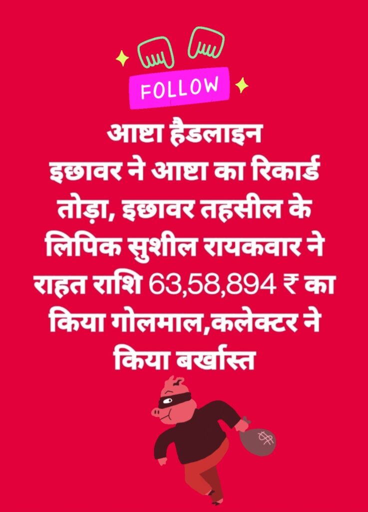 कलेक्टर बालागुरु के. द्वारा शासकीय राशि के दुरुपयोग के गंभीर मामले में कड़ी कार्रवाई करते हुए इछावर तहसील कार्यालय में पदस्थ सहायक वर्ग-03 (लिपिक) सुशील कुमार रायकवार को शासकीय सेवा से बर्खास्त कर दिया गया है। विभागीय जांच में शासकीय राशि 63,58,894 रुपये के दुरुपयोग की पुष्टि होने पर यह कार्रवाई की गई।