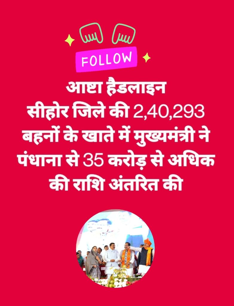 मुख्यमंत्री डॉ. मोहन यादव ने खंडवा जिले के पंधाना में आयोजित राज्य स्तरीय कार्यक्रम में लाड़ली बहना योजना अंतर्गत प्रदेश की लगभग 01.25 करोड़ से अधिक पात्र बहनों के खातों में 1836 करोड़ रुपये से अधिक की राशि अंतरित की। मुख्यमंत्री डॉ यादव ने प्रदेश के साथ ही सीहोर जिले की 2,40,293 बहनों के खातों में 35 करोड़ 40 लाख 21 हजार रूपये की राशि अंतरित की