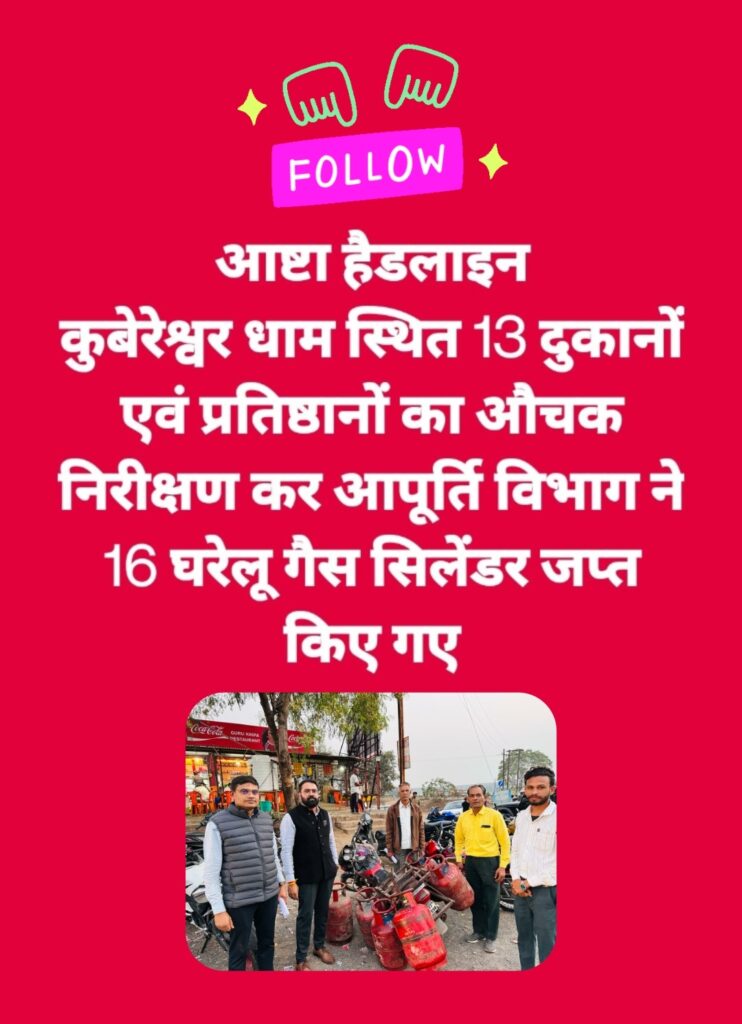 कार्रवाई में घरेलू गैस सिलेंडरों का व्यवसाय के लिए उपयोग करने वाली दुकानों एवं संस्थानों की जांच कर उपयोग किए जा रहे घरेलू गैस सिलेंडर जब्त किए जा रहे हैं एवं कार्रवाई की जा रही है। कनिष्ठ आपूर्ति अधिकारी आकाश चंदेल ने बताया कि जांच के दौरान कुबेरेश्वर धाम स्थित 13 दुकानों एवं प्रतिष्ठानों का औचक निरीक्षण कर कार्रवाई करते हुए 16 घरेलू गैस सिलेंडर जब्त किए गए।