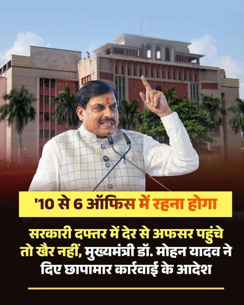 मुख्यमंत्री के स्पष्ट निर्देशों के बाद प्रदेश के सरकारी कार्यालयों में समयपालन को लेकर सख्ती शुरू कर दी गई है। राजधानी भोपाल स्थित वल्लभ भवन सहित अन्य शासकीय दफ्तरों में अधिकारियों और कर्मचारियों की समय पर उपस्थिति सुनिश्चित करने के लिए छापामार कार्रवाई के निर्देश दिए गए हैं।सरकार ने साफ किया है कि सुबह 10 बजे से शाम 6 बजे तक सभी अधिकारियों और कर्मचारियों की अनिवार्य रूप से कार्यालय में मौजूदगी सुनिश्चित की जाएगी। इसके तहत वल्लभ भवन, विंध्याचल, सतपुड़ा भवन तथा अन्य सरकारी कार्यालयों में उपस्थिति, आने-जाने के समय और अनधिकृत अनुपस्थिति की जानकारी व्यवस्थित रूप से संकलित की जाएगी।