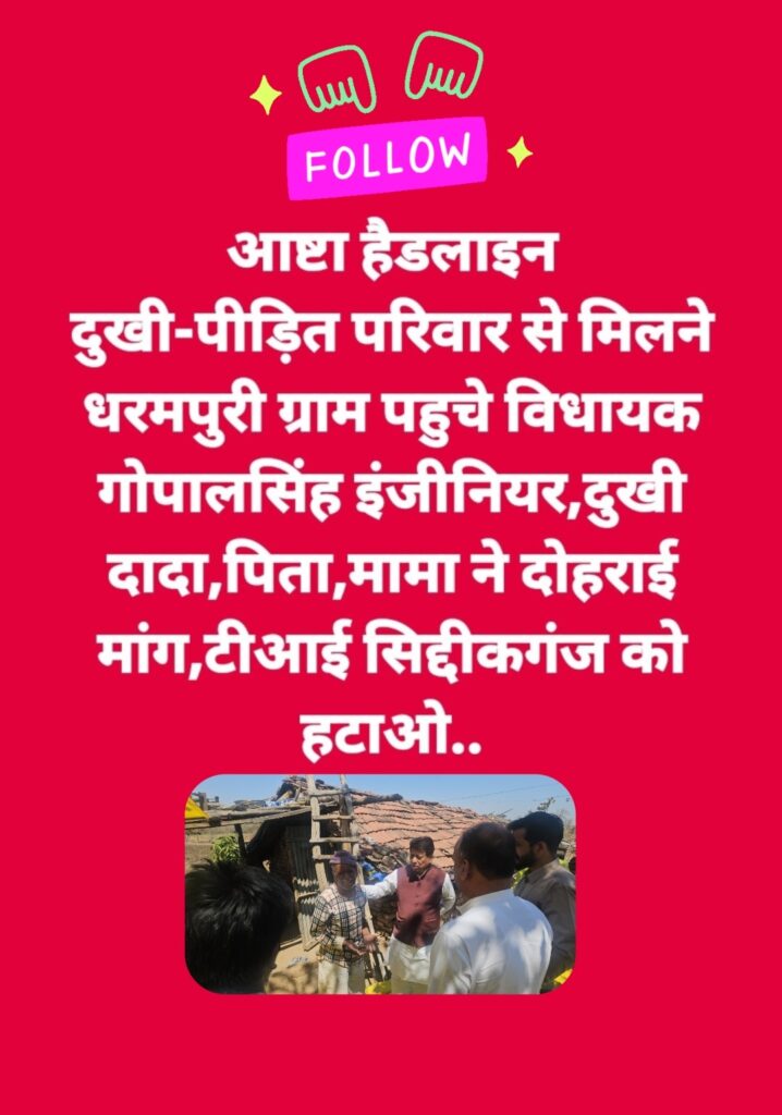 आज आष्टा विधायक गोपालसिंह इंजीनियर दुखी परिवार के बीच शोक संवेदना व्यक्त कर उनसे मिलने,चर्चा कर उनकी पीड़ा सुनने ग्राम धरमपुरी पहुचे ओर दोनों मृतक बालक एवं बालिका के प्रति श्रद्धांजलि अर्पित कर बच्चों के दादाजी,पिता जी मामाजी को दुख की इस विकट घड़ी में सांत्वना दी एवं ढाढस बंधाया ।