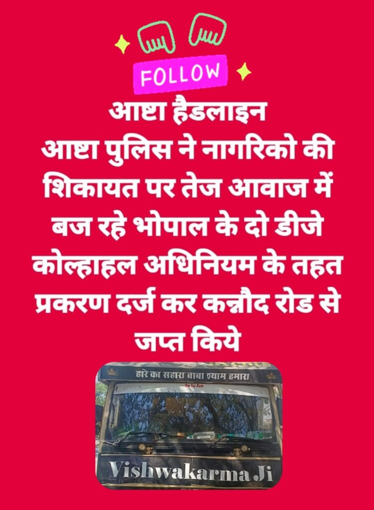 आमजन की सूचना पर थाना आष्टा पुलिस द्वारा मौके पर पहुंचकर डीजे को बंद कराया गया तथा डीजे संचालक व चालक के विरुद्ध विधि अनुसार कार्रवाई करते हुए डीजे जप्त किया जाकर मध्यप्रदेश कोलाहल नियंत्रण अधिनियम धारा 7/15 के तहत प्रतिबंधित वैधानिक कार्रवाई कर प्रकरण पंजीवद्ध किया गया है।डीजे की तेज आबाज बच्चो, बुजुर्गो के स्वास्थ पर हानिकारक व विपरीत प्रभाव डाल सकती थी।