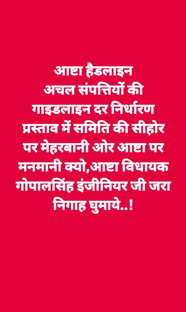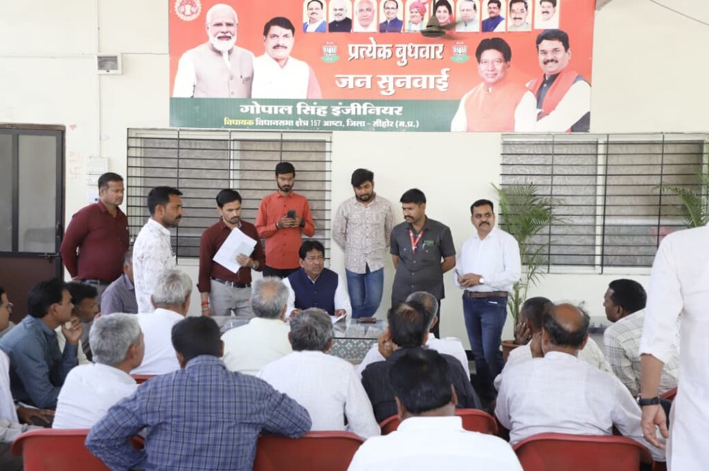 विधायक गोपालसिंह इंजीनियर ने आज जनसुनवाई में आये अन्य कई ग्रामो के ग्रामीण जनों की वन टू वन मिल कर समस्याओं को सुना । स्मरण रहे प्रत्येक बुधवार को आष्टा विधायक अपने कार्यालय में सुबाह 10 बजे से जनता की समस्याओं को सुनने,उनेह हल करवाने के लिये जनसुनवाई करते है । आज बुधवार को प्रातः 10 बजे से कार्यालय में उपस्तिथ रह कर विधायक गोपालसिंह इंजीनियर ने जनता की समस्याओं को सुना एवं उनकी समस्याओं को हल करने के सम्बंधित अधिकारियों को निर्देश दिये । आष्टा विधायक गोपालसिंह इंजीनियर जो की हर बुधवार को अपने कार्यालय में जन सुनवाई कार्यक्रम के तहत उपस्तिथ रहते है । आज भी बड़ी संख्या में क्षेत्र से नागरिक जनसुनवाई में पहुचे एवं अपनी अपनी पीड़ा से विधायक को अवगत कराया एवं आवेदन दिये। जनता से प्राप्त आवेदनों पर विधायक ने कहा की आपका जन सेवक होने के नाते आपकी समस्याओं को सुनना, हल करना मेरा धर्म है।
